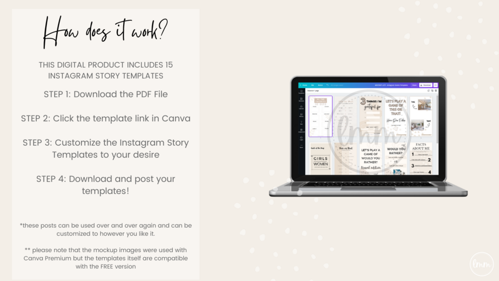 The images used for the mockups of this product are from Premium Canva. If you don't have a premium account, you can upload your own photos or use what's available to you in the FREE Canva version.