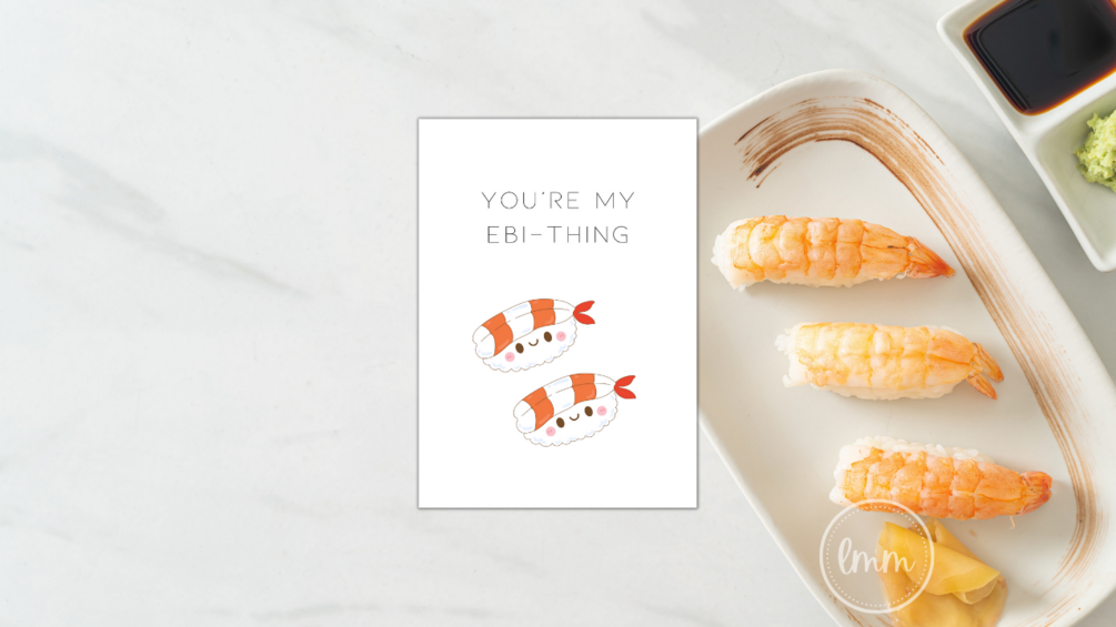 This Cute Ebi-thing Sushi Card is a cute card that you can give to people who are obsessed with sushi and love sushi puns! Use this simple, minimalist card for anniversaries, thank yous, birthdays or any other occasion! This product is a digital file and comes after purchase via PDF. You can print the PDF as is or you can edit the template and download the images on Canva. You get the files immediately and can send it to your local print shop or print them at home!