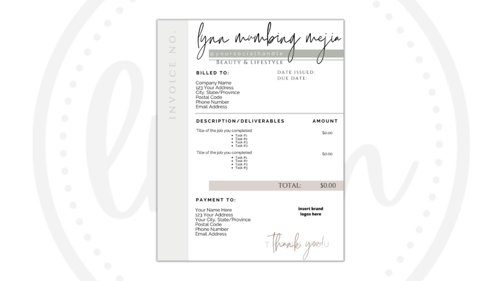 The brand package Nora is all about minimal and neutral colours and the designs are inspired by a simple and modern aesthetic. What you'll find in this 1 Page Customizable Invoice Canva Template is gorgeous cursive fonts, modern regular fonts, thin lines, simple shapes, and so many more beautiful details!